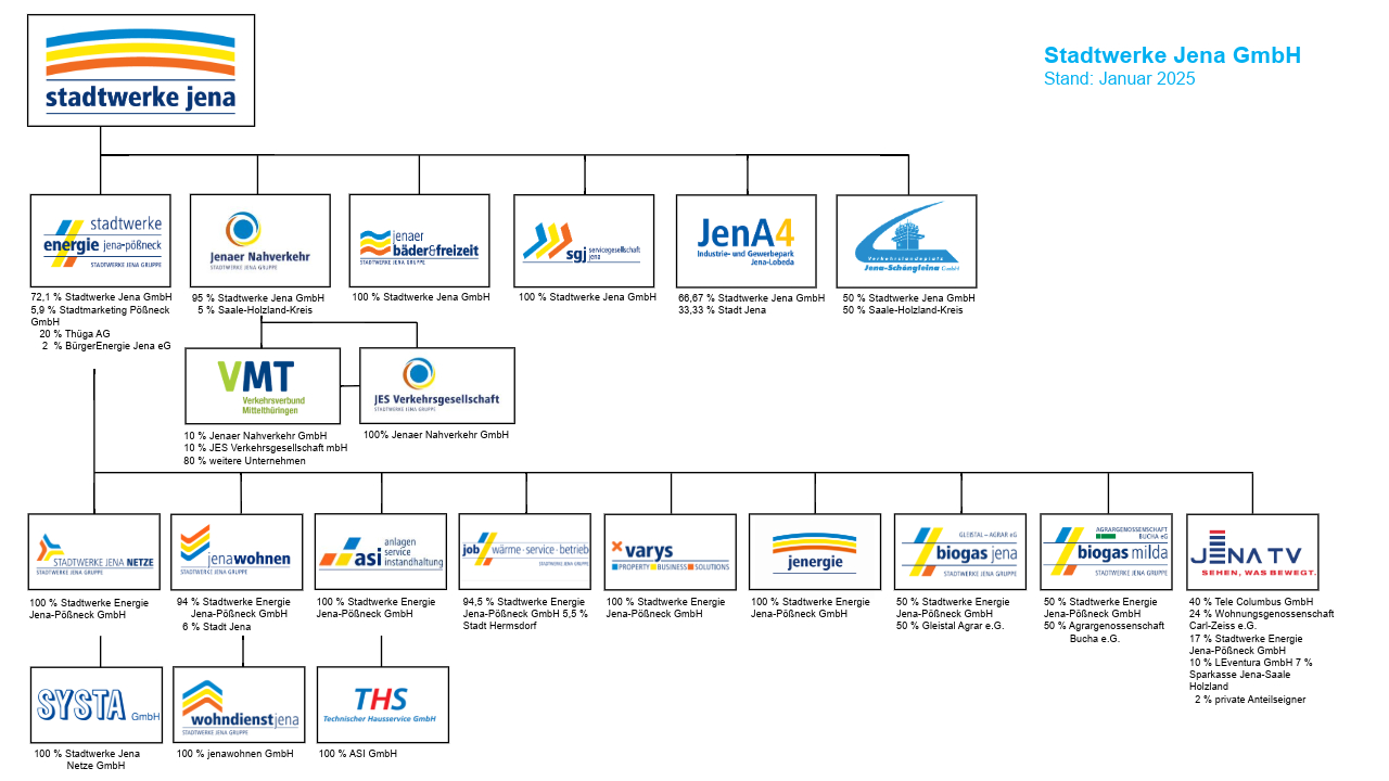 Die Stadtwerke Energie Jena-Pößneck GmbH wurde am 23. April 1991 gegründet. Sie ist eine Unternehmenstochter der Stadtwerke Jena GmbH (72,1%). Weitere Anteile halten vier vorwiegend kommunale Gesellschafter: die Stadtmarketing Pößneck GmbH (5,9%), die thüga AG (20%) sowie die Bürgerenergie Jena eG (2%).