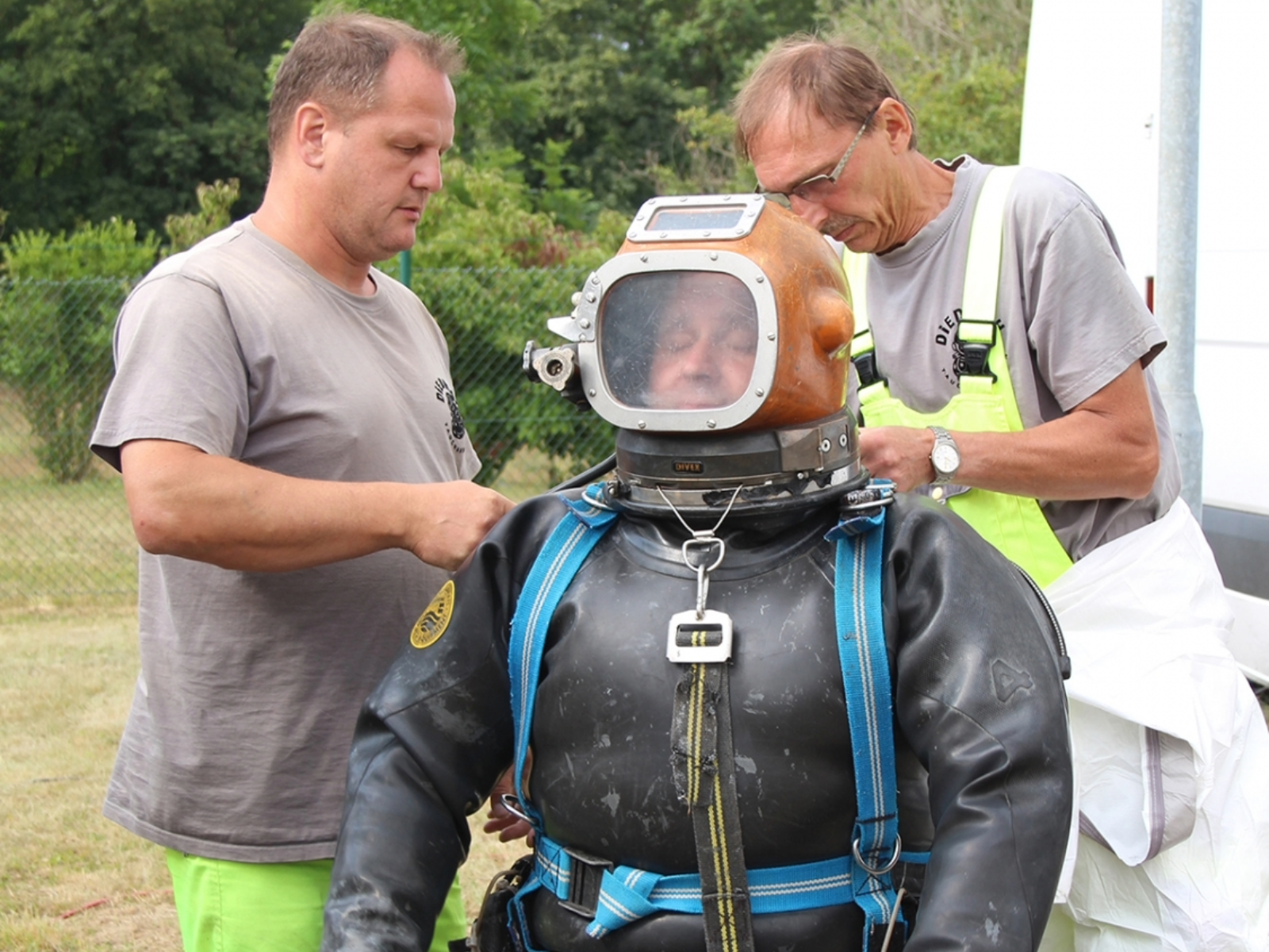 Es hatte schon was von Jules Verne und seinem Kapitän Nemo, wie Marco Fenske in Vollgummianzug und massivem Tauchhelm in die brackig-braunen Fluten stieg. Die Bleigewichte am Gürtel machen seine Schritte schwer und das Übersteigen des Geländers mühevoll. Nicht ganz 20.000 Meilen unter das Meer, aber immerhin neun Meter in die Tiefe führt ihn sein Arbeitsweg: Auf den Grund des Belebungsbeckens in der Kläranlage Magdala.