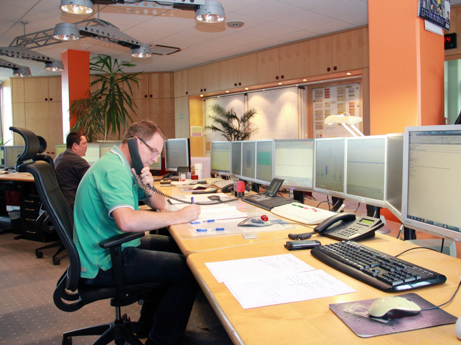 Um die acht bis zehn Bildschirme zierten zwischenzeitlich den Arbeitsplatz der Leitstellenkollegen. Inzwischen ist jeder Arbeitsplatz „nur noch“ mit einem einzelnen extragroßen sowie zwei normalen Bildschirmen ausgestattet. Die Zahl der zu beobachtenden Anzeigen ist dennoch gleichgeblieben: Von den unterschiedlichen Leitsystemen für die jeweiligen Medien über Brandmeldeanlagen, Videoüberwachungen bis hin zu Notrufsystemen für allein arbeitende Kollegen reicht da die Bandbreite.