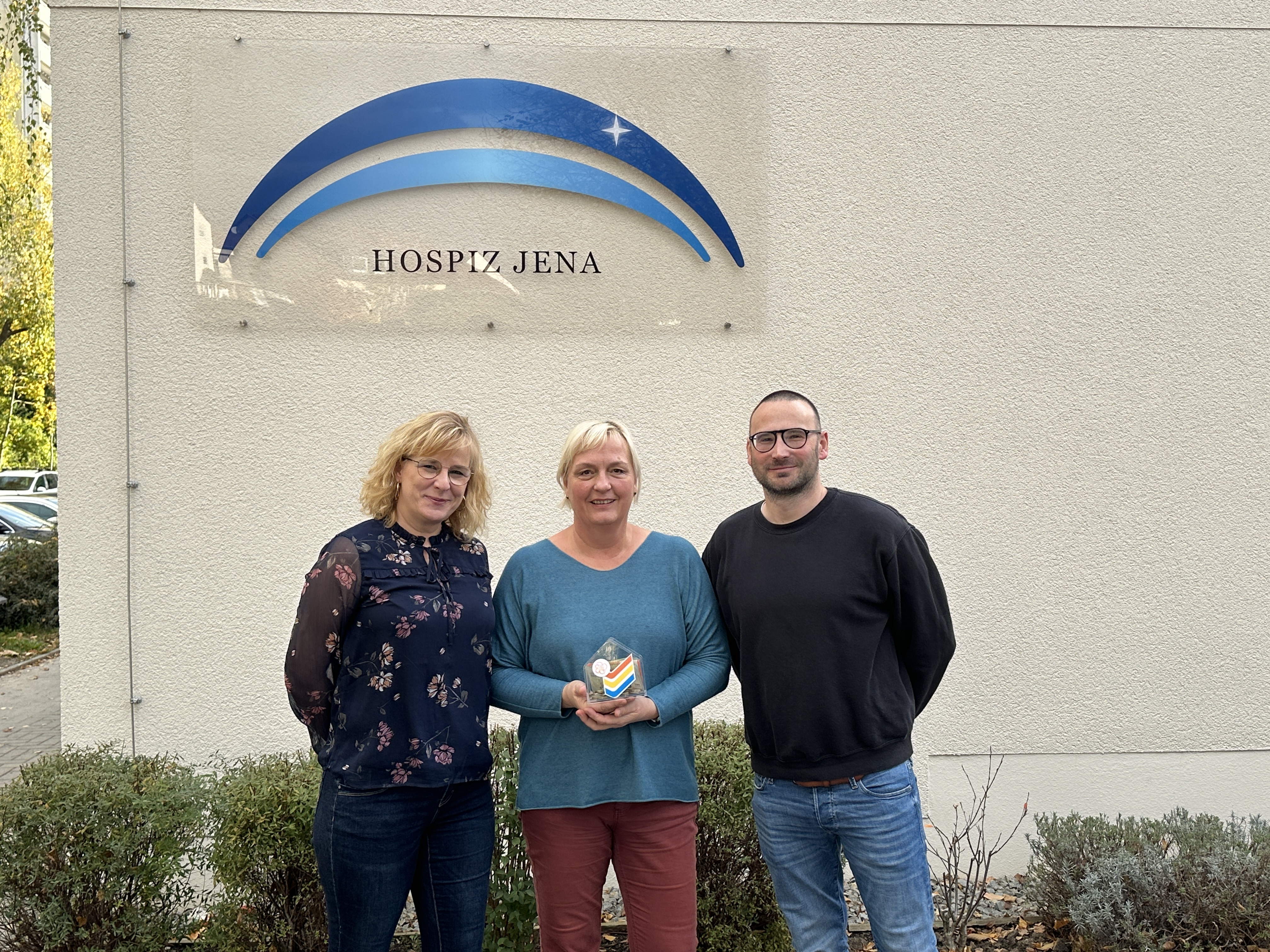 Foto: Koordinatorin der Trauerbegleitung im Hospiz Jena Kerstin Löschner (Mitte), Teammitglieder des kreativen Baubüros Marion Clausing (links) und André Güttler (rechts)