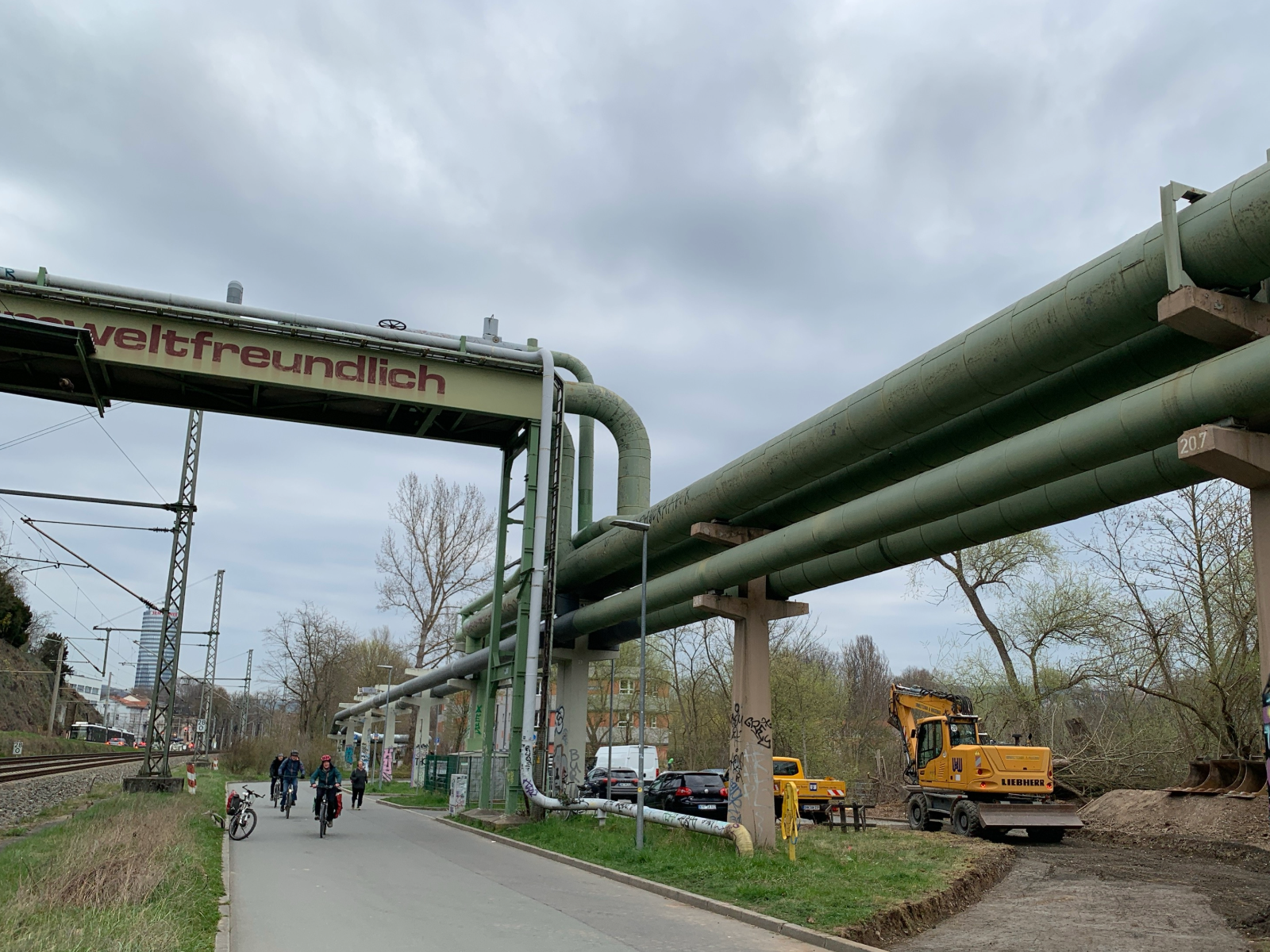 An der Rohrbrücke im Burgauer Weg befindet sich der Einbindepunkt des bisherigen Dampfnetzes ins Hauptnetz. Dort und an der Rohrbrücke selbst werden in den kommenden Monaten umfangreiche Montagearbeiten durchgeführt. Bereits im vergangenen Jahr hatten die Stadtwerke Jena Netze begonnen, die aus dem Jahr 1968 stammende Brücke zu ertüchtigen, damit sie das höhere Gewicht der künftig mit flüssigem Wasser statt gasförmigem Dampf gefüllten Fernwärmeleitungen tragen kann. Dafür wurden im Brückenabschnitt über der Kahlaischen Straße bereits Armaturen und Leitungen, Rohr- und Brückenlager erneuert. Nun erfolgt dies noch für den Brückenabschnitt im Burgauer Weg und über den Bahngleisen. Für die Baumaßnahme an der Brücke sind die Stadtwerke abhängig von einer Gleissperrung durch die Deutsche Bahn AG, die nur im Zeitraum vom 5. bis 23. Mai möglich war.