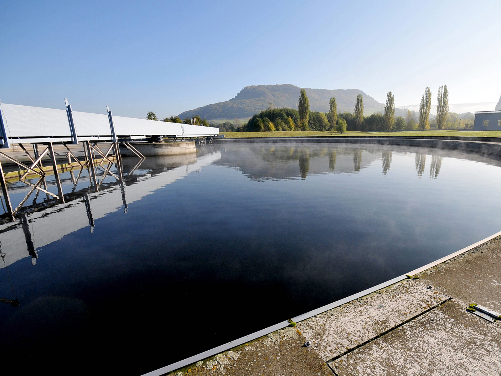 Das Konzept sieht vor, den Wasserfluss der Nachklärung, welcher ein ganzjährig günstiges Temperaturniveau von 7 bis 20°C bietet, mit einem Wärmetauscher auszukühlen, die entzogene Wärme mittels einer zentralen Wärmepumpe hocheffizient auf ein höheres Temperaturniveau zu heben und damit ein Wärmenetz mit einer Vorlauftemperatur von ca. 25°C zu speisen.