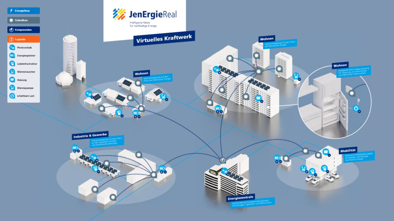 Bis 2027 soll ein virtuelles Kraftwerk errichtet und betrieben werden, welches als Zielmaßstab die Stadt Jena abbilden soll. So wollen die Forschenden zeigen, dass mit konsequenter Sektorenkopplung eine nachhaltige Energieversorgung in Städten möglich ist. Dafür sollen über das Stadtgebiet von Jena verteilt verschiedene elektrische (Strom) und thermische (Wärme) Großspeicher mit einer Gesamtleistung von 3,75 MW errichtet werden. Deren Standorte sollen exemplarisch verschiedene Sektoren des städtischen Energiesystems abbilden.